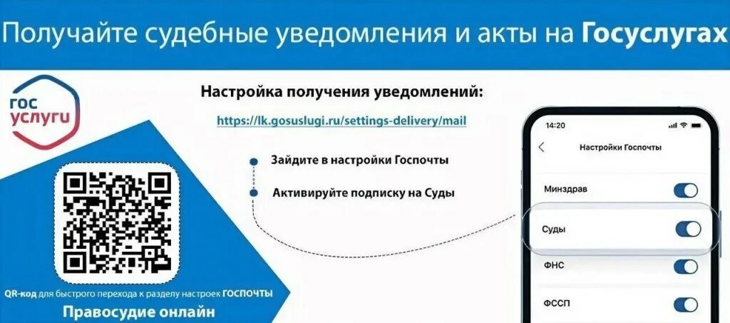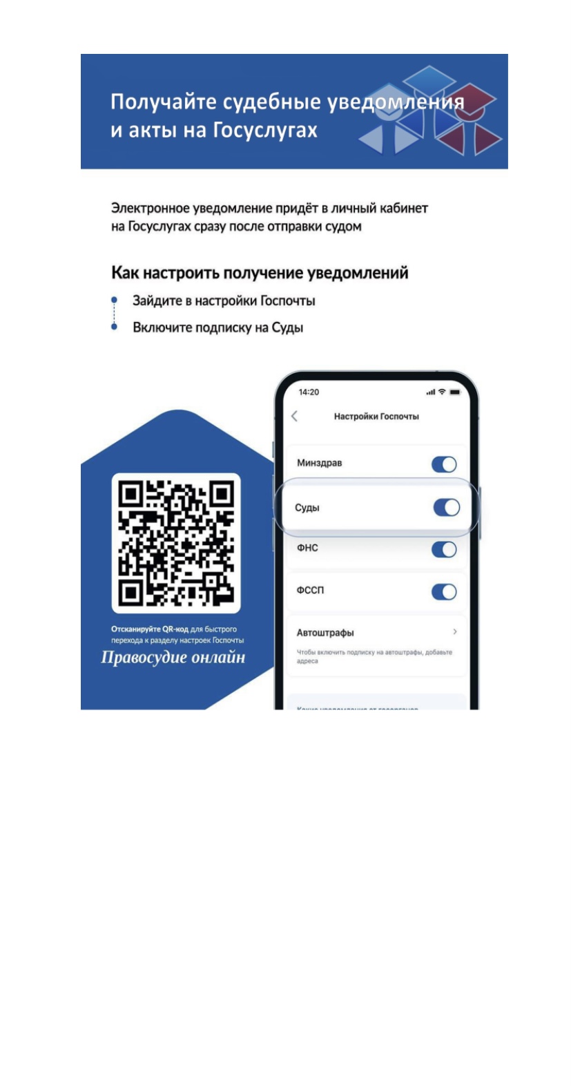 QR-код для перехода на страницу Портала государственных услуг Российской Федерации в части получения гражданами судебных уведомлений в электронном виде
